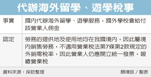 財政部台北國稅局表示,營業人代辦海外留學、遊學服務,收取國外學校給付的佣金收入,依加值型及非加值型營業稅法第1條及第4條規定,屬於在境內銷售勞務,故應依法開立應稅統一發票報繳營業稅。