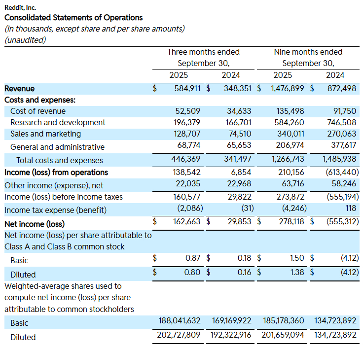 綜合外媒報導,Reddit於30日美股盤後公布,2025年第三季,營收年增68%至5.85億美元,超越FactSet統計的分析師預估值5.49億美元,淨利從一年前的3,000萬美元增至1.63億美元(每股80美分),大幅優於市場預期的52美分;當季廣告收入激增74%至5.49億美元。