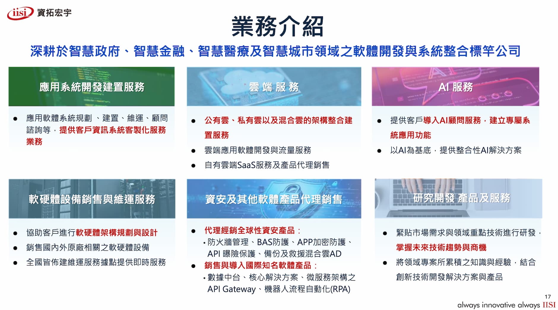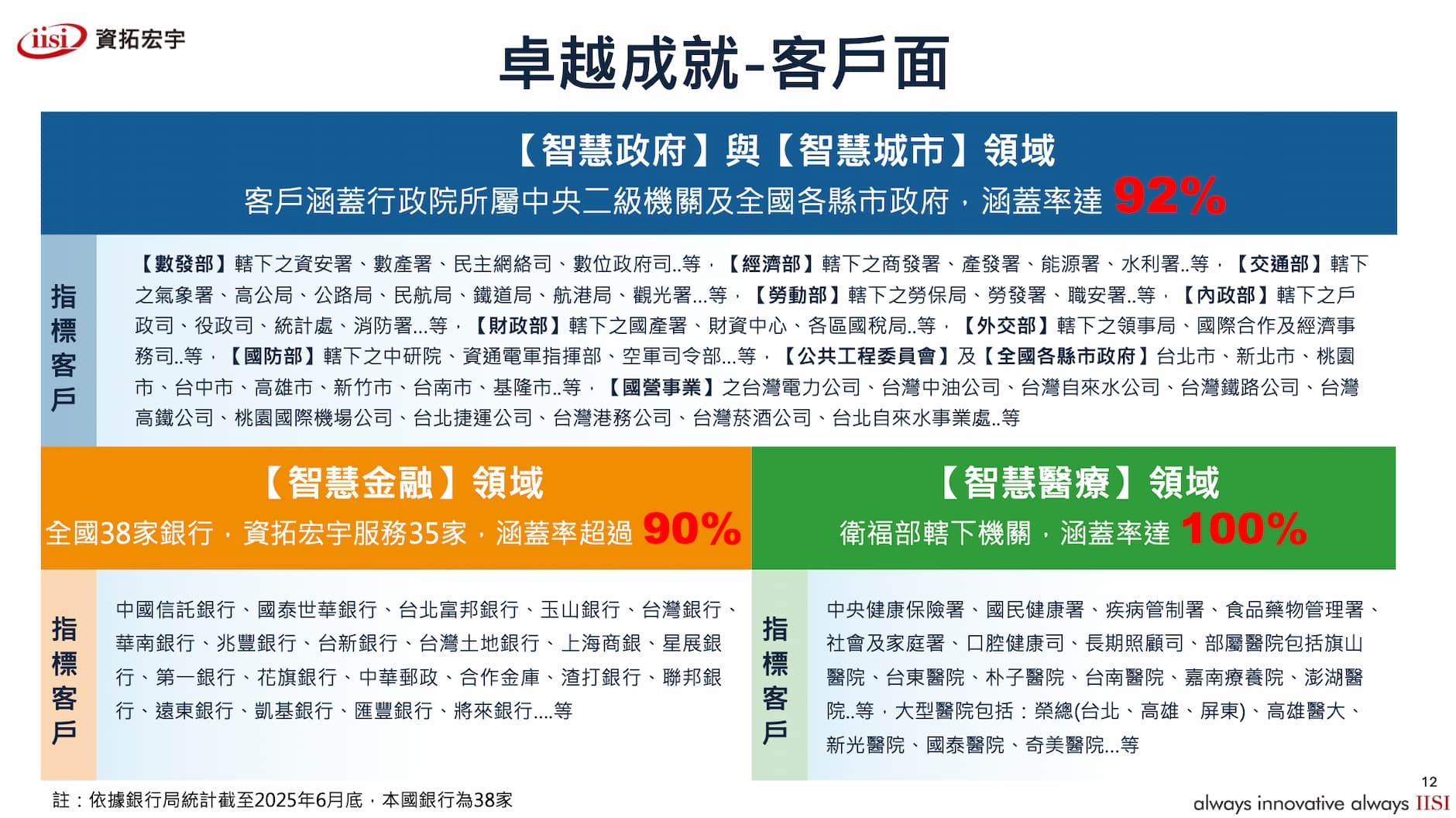 資拓宏宇今日舉辦上市前業績發表會,預計 11 月底掛牌交易,董事長吳麗秀表示,目前是公部門標案與金融核心系統領域的市占龍頭,並結合 AI、雲原生、數據治理及 5G AIoT 等核心技術,憑藉高技術門檻的專案交付能力與多元產品線布局,持續擴大國內外市場的成長動能。