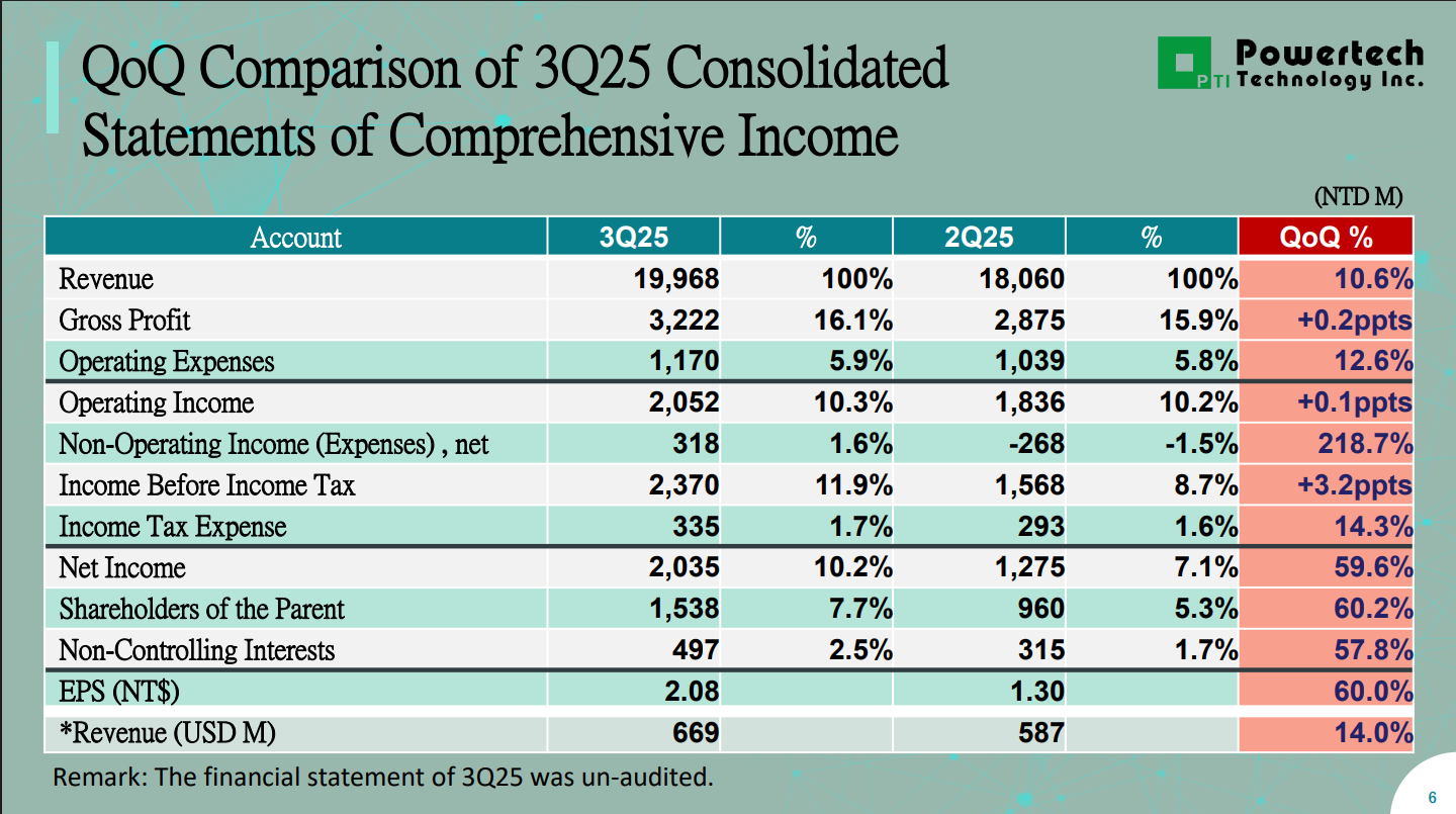 力成第三季營收金額為新台幣 199.68 億元,較第二季增加 10.6%,較2024年同期增加 9.1%,毛利率 16.1%,較第二季增加 0.2 個百分點,較2024年同期減少 5.3 個百分點。稅後純益 15.38 億元,較第二季增加 60.2%,較2024年同期減少 9.5%,EPS為 2.08 元。累計,前三季營收 535.22 億元,較2024年同期減少 4.8%,毛利率 16.3%,較2024年同期減少 3 個百分點,稅後純益 36.73 億元,較2024年同期減少 30.2%,EPS為 4.96 元。
