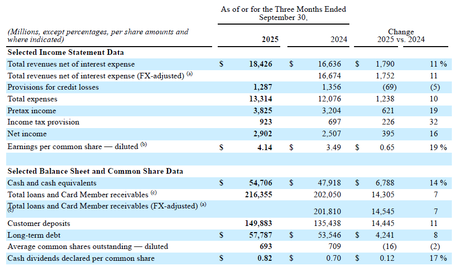 華爾街日報、Investopedia等外媒報導,美國運通17日公布,第三季營收年增11%至184.3億美元,創歷史新高,每股盈餘為4.14美元,雙雙優於分析師預期,主要受惠高階信用卡改版和富裕族群的消費成長。