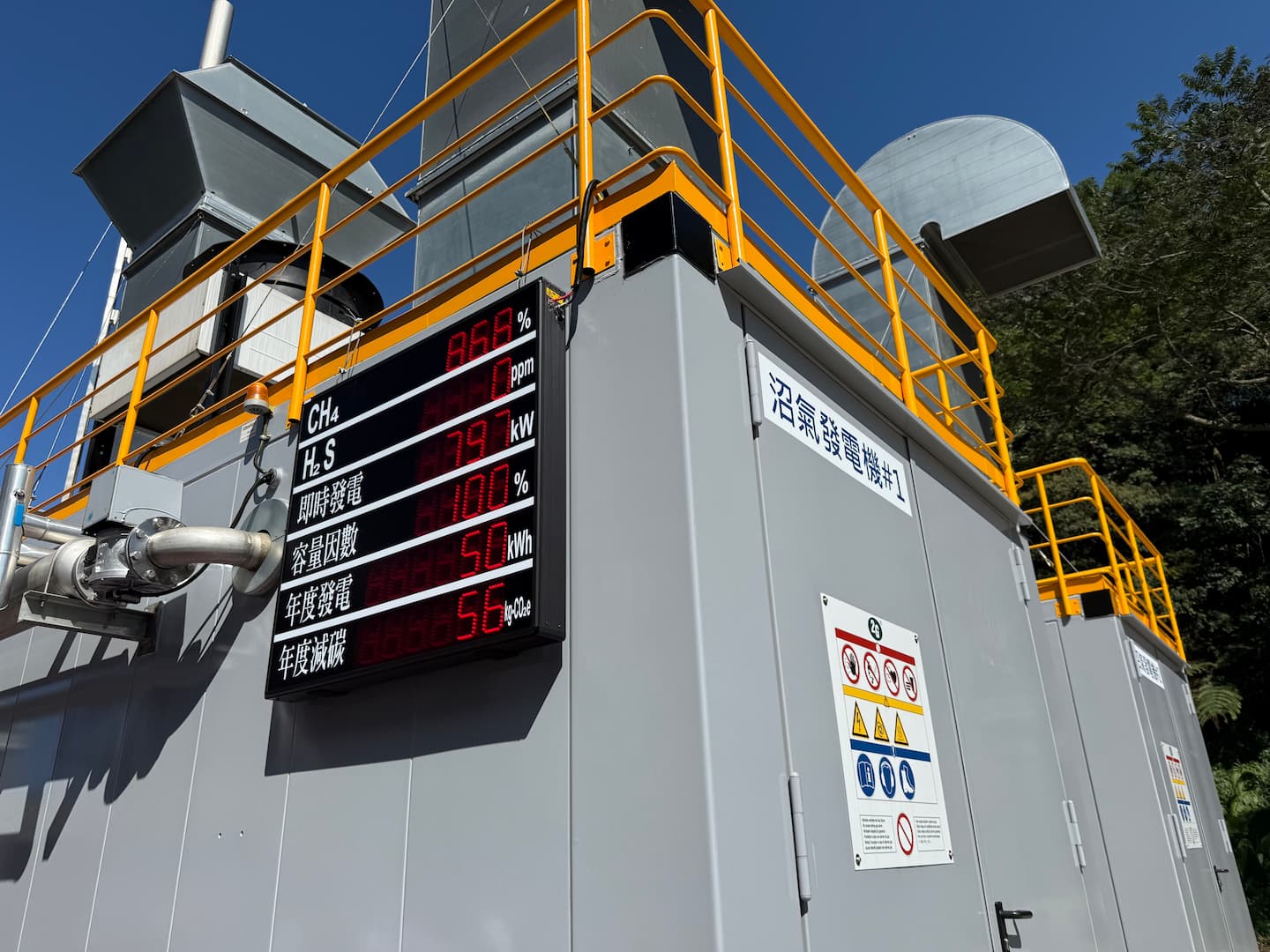 蕭振宗說明,永豐餘的厭氧菌培養技術,帶來穩定充足的沼氣量,舉例來說,龜山水資源回收中心的沼氣發電能產生甲烷(CH₄)約 86.8%,相較台灣其他沼氣發電產生的甲烷平均是 65%,提供發電效率每立方公尺發電達 3.2 度,同時具備「創能、減廢、減碳」三重效益。