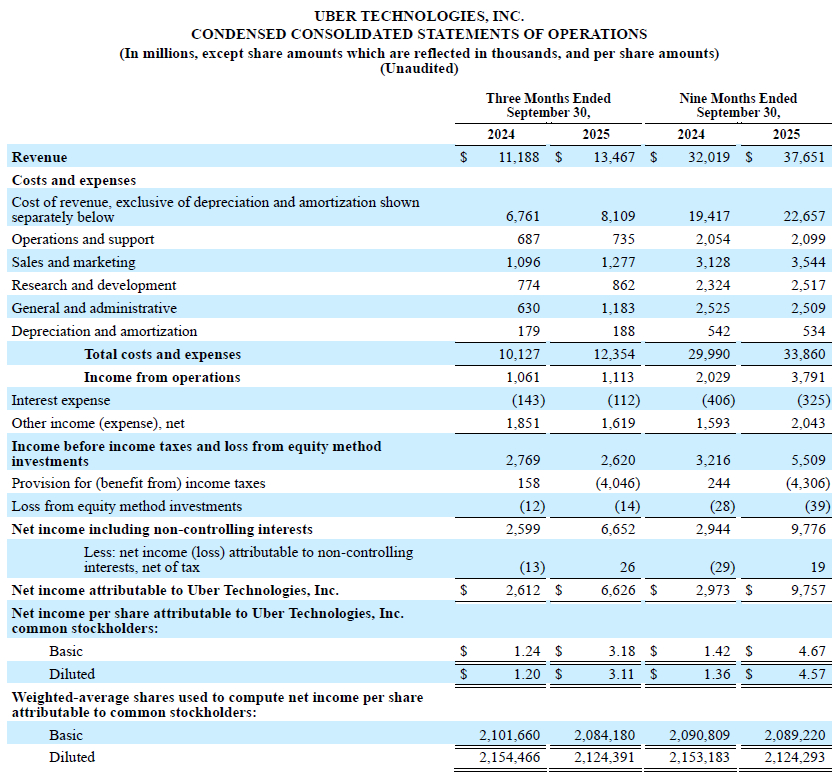 MarketWatch、路透等外媒報導,Uber於4日公布,第三季營收年增20%至134.7億美元。當季營業利益約11.1億美元,低於Visible Alpha統計的分析師預估值16.1億美元,主因受到未披露的法律和監管成本增加影響。